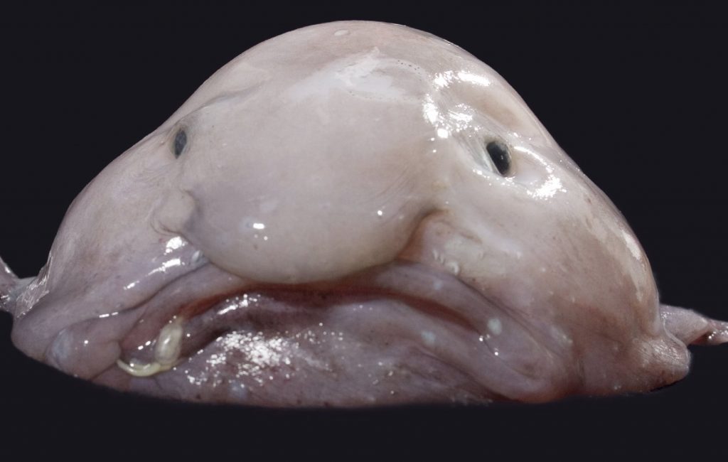 Blobfish o pez mancha: vive a unos 1.000 metros de profundidad, y bonito, bonito no es, pero tiene un aire familiar y tierno que recuerda a la caricatura de la cara de un humano. Su aspecto es gelatinoso debido a la profundidad donde vive y a la presión que tiene que soportar. La poca densidad de su cuerpo le permite flotar en el fondo marino sin gastar casi energía.